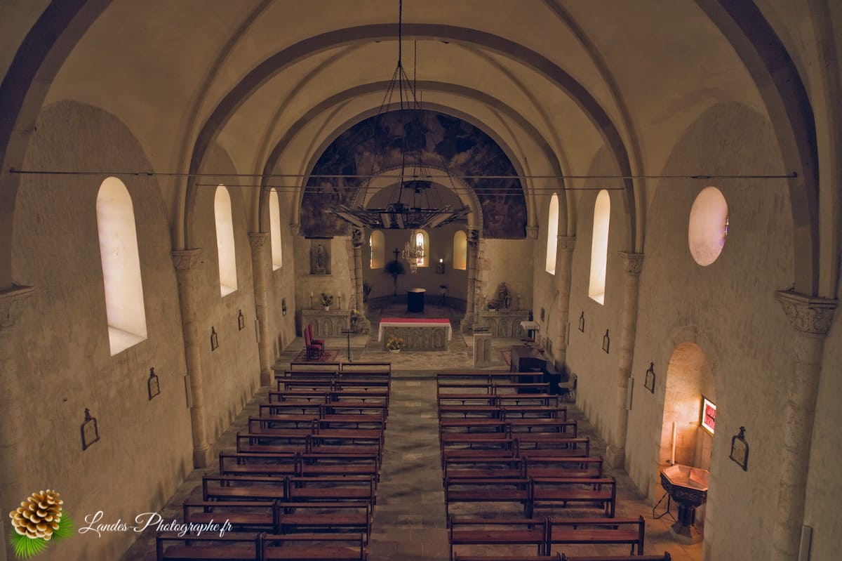 - Les Galeries en Bois : L’intérieur est caractérisé par la présence des galeries en bois traditionnelles, qui courent le long de la nef. Ces tribunes, autrefois réservées aux hommes, augmentent la capacité d’accueil et ajoutent un cachet chaleureux et unique, signature des églises du Sud-Ouest.