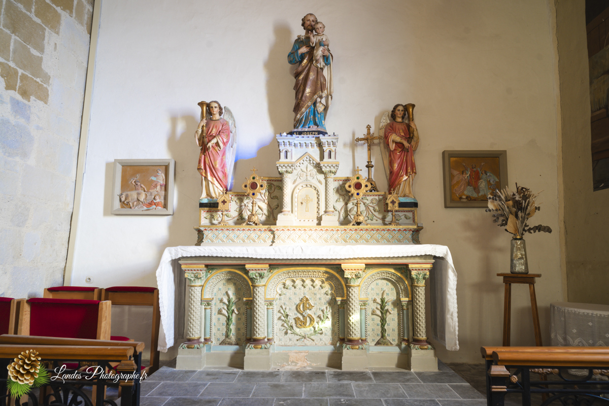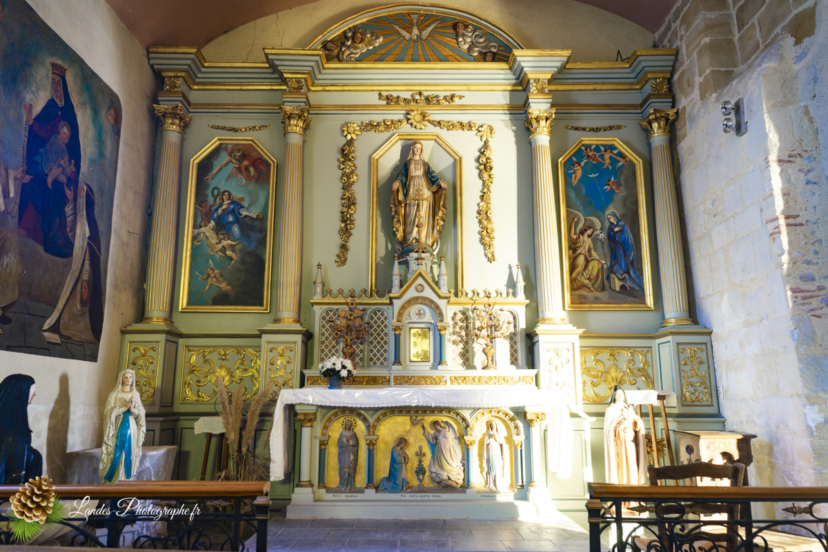 - Les Galeries : À l’intérieur, comme beaucoup d’églises landaises, elle comporte traditionnellement des galeries en bois qui ajoutent à son caractère unique et chaleureux.