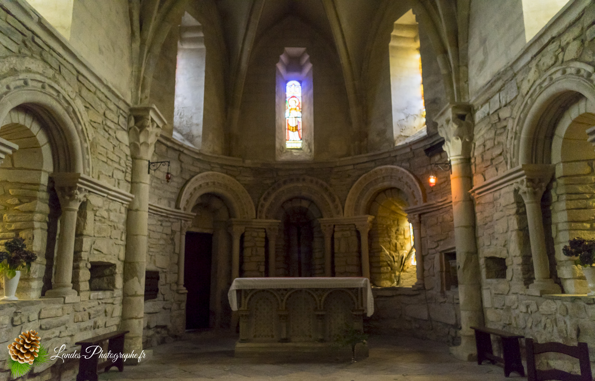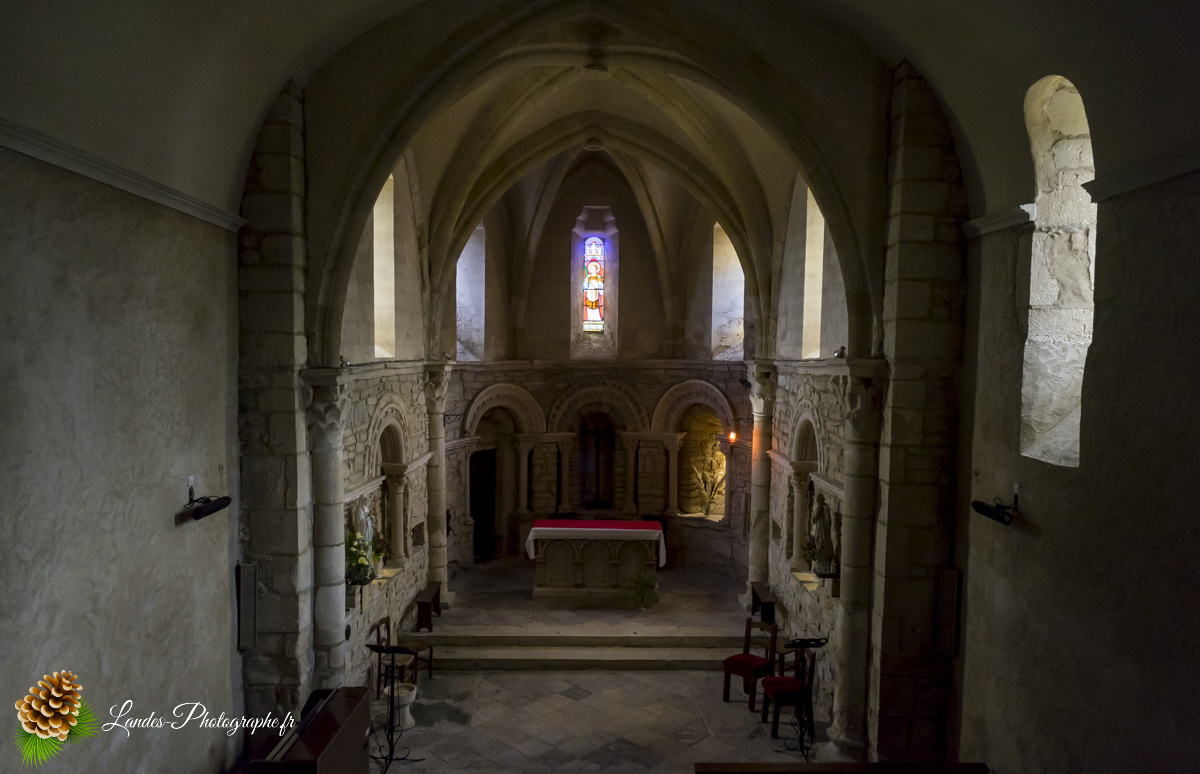 • Le chœur abrite une élégante arcature romane à cinq fenêtres. Les voussures retombent sur de petites colonnettes ornées de chapiteaux finement sculptés.