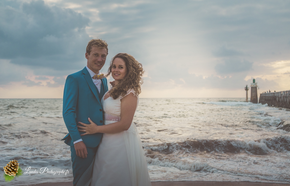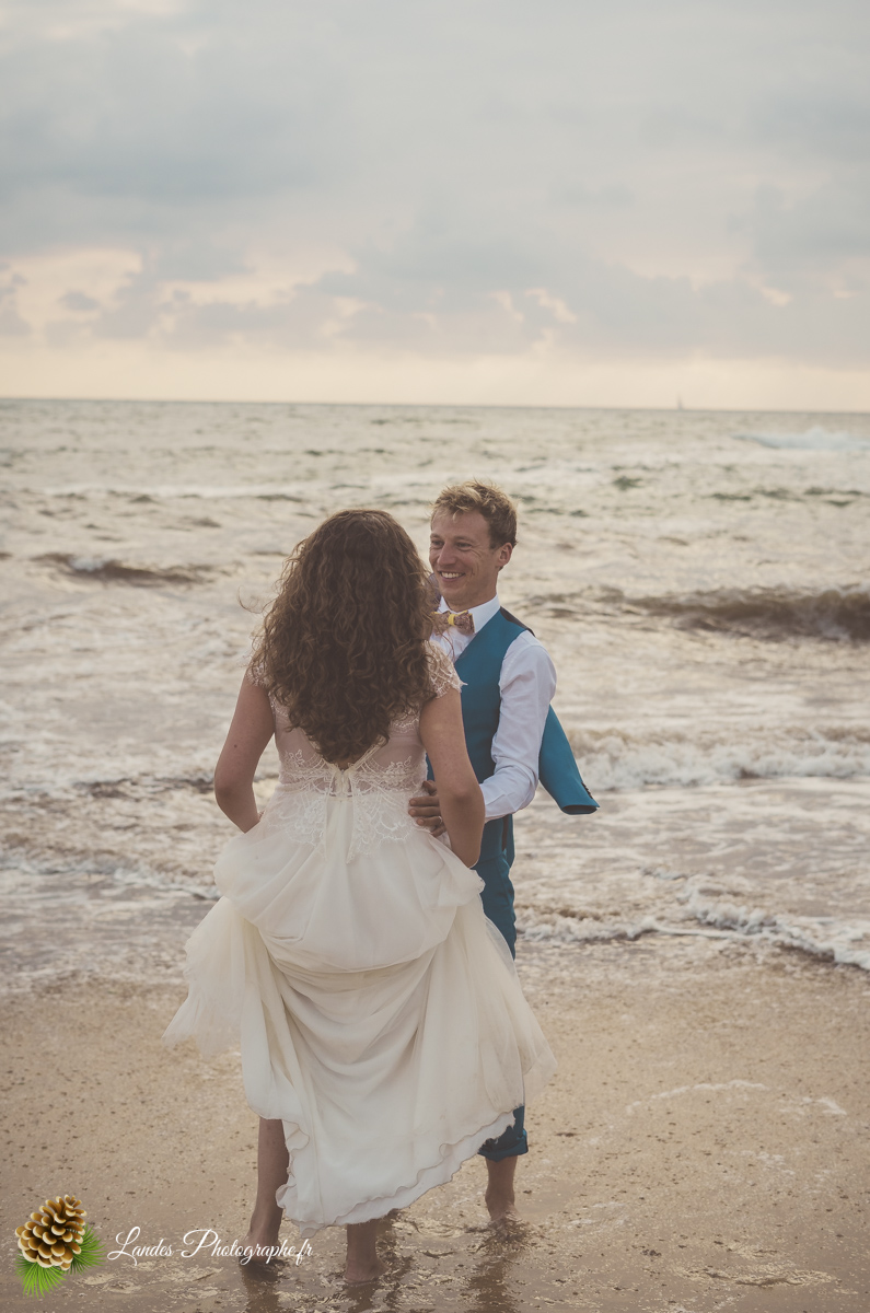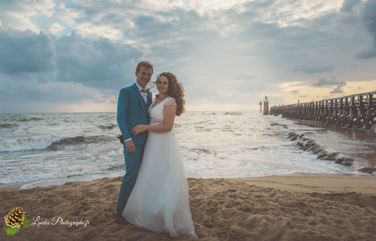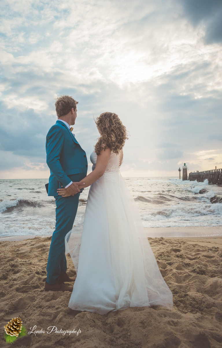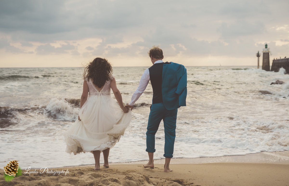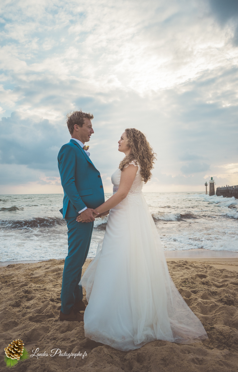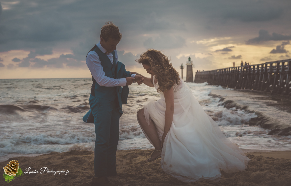 - L’Élégance face à l’Océan : Saisir le contraste saisissant entre la dentelle de la robe de mariée et la puissance des vagues landaises, créant des compositions poétiques et dynamiques.